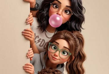 Crie uma ilustração cartoon estilizada em 3D de alta qualidade baseada nas referências enviadas de uma família composta por pai, mãe, uma filha adolescente e um menino (crie os filhos), todos usando óculos estilosos e modernos.
