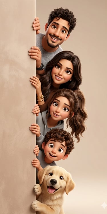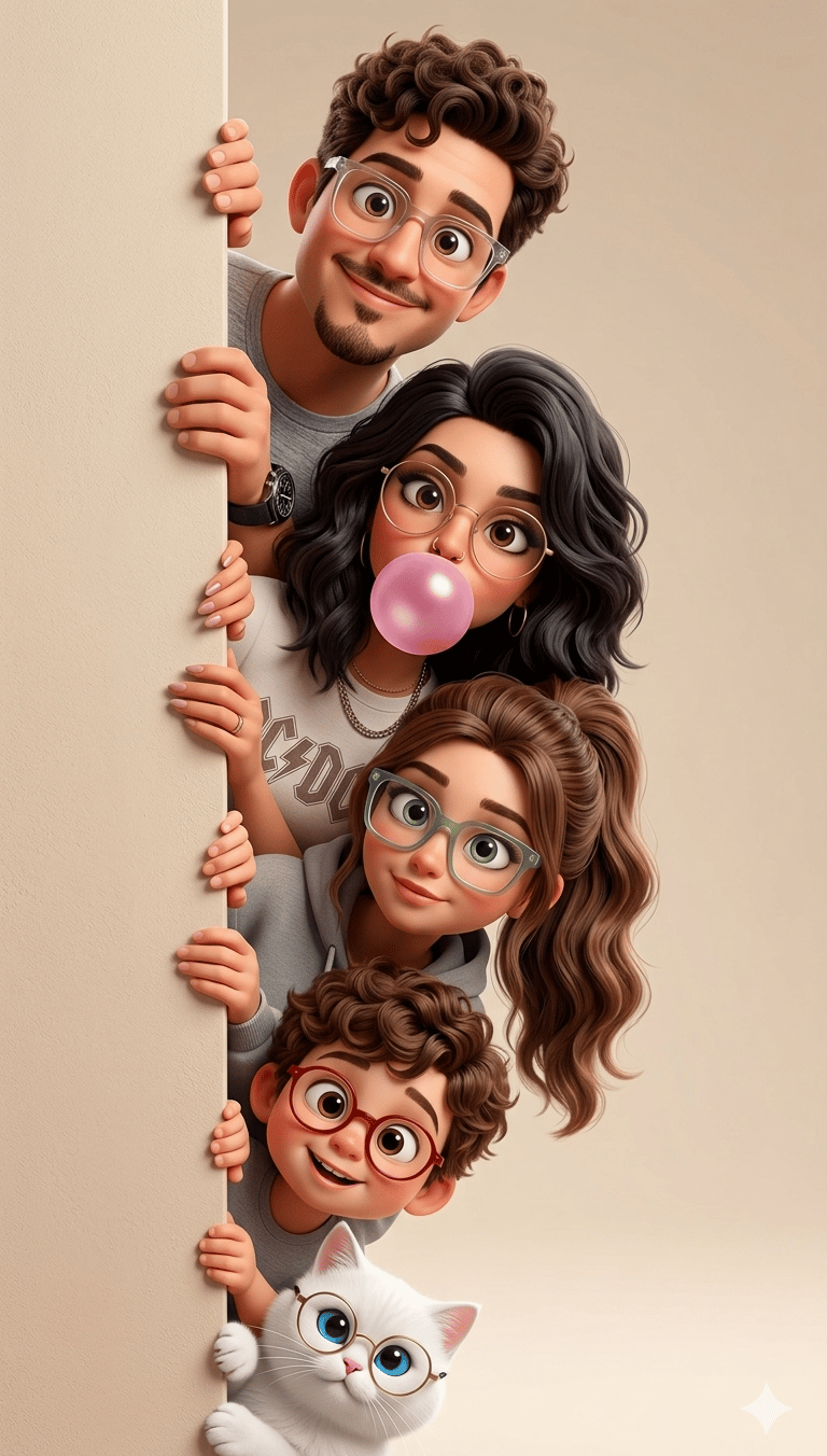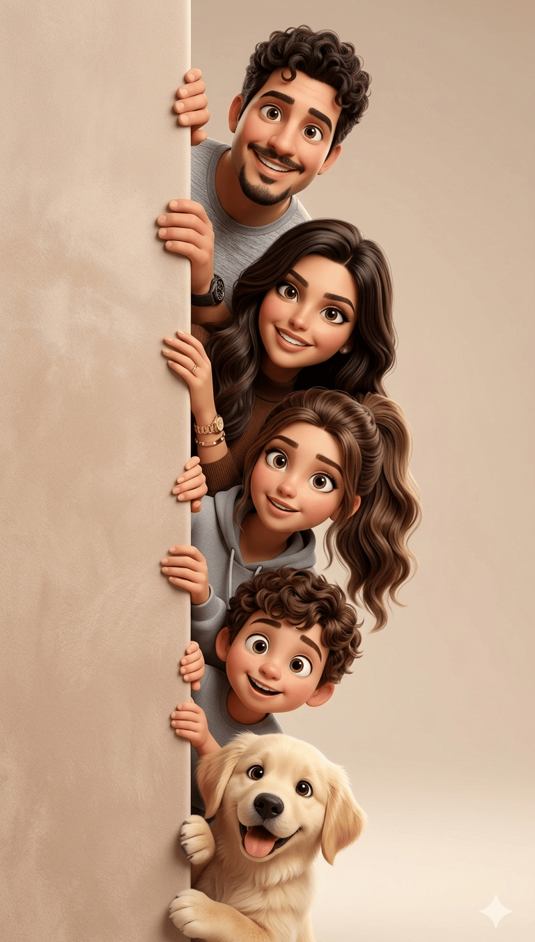 Crie uma ilustração cartoon estilizada em 3D de alta qualidade baseada nas referências enviadas de uma família composta por pai, mãe, uma filha adolescente, um menino (crie os filhos) e um cachorro da família. Todos estão espiando por trás de uma parede vertical fosca no lado esquerdo da moldura, como se estivessem curiosos observando algo fora da cena.