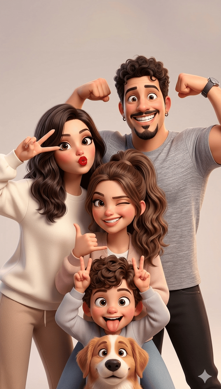 Crie uma ilustração cartoon estilizada em 3D de alta qualidade baseada nas referências enviadas de uma família composta por pai, mãe, uma filha adolescente e um menino (crie os filhos), todos fazendo poses engraçadas e cheias de personalidade, como se estivessem se divertindo em uma sessão de fotos divertida.
