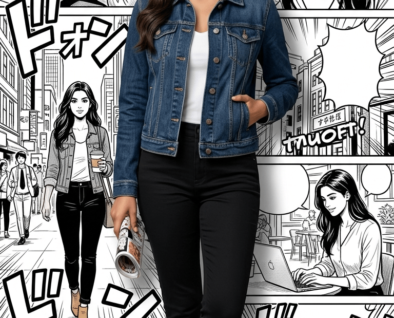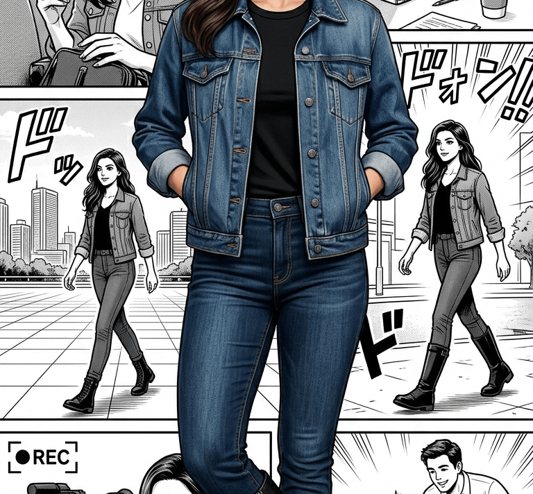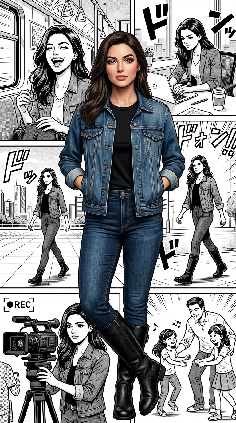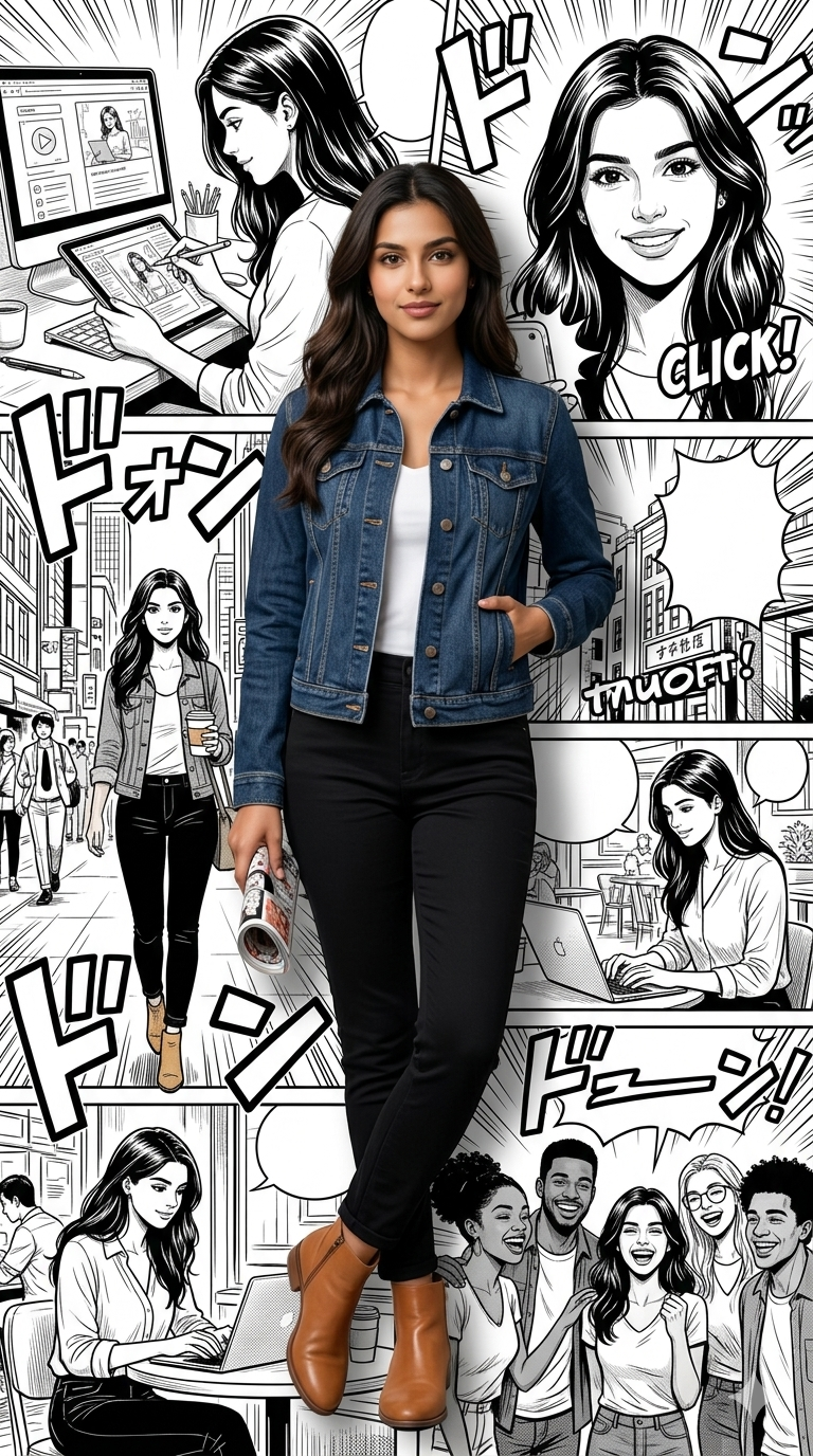 A woman whose face exactly matches the reference photo (100% identical wears a denim jacket, black T-shirt, jeans, and tall black boots, standing centered in a relaxed pose with one leg crossed and both hands in his jacket pockets, looking neat, clean, modern, and masculine. Behind him is a black-and-white manga comic collage showing him laughing on a train, working in an office,