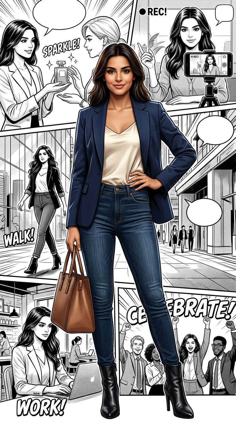 A confident modern heroine whose face exactly matches the reference photo stands centered in a powerful pose. She wears a stylish urban outfit: fitted blazer, elegant top, dark jeans, and high-heel boots. One leg slightly forward, shoulders relaxed but confident, looking directly toward the viewer.