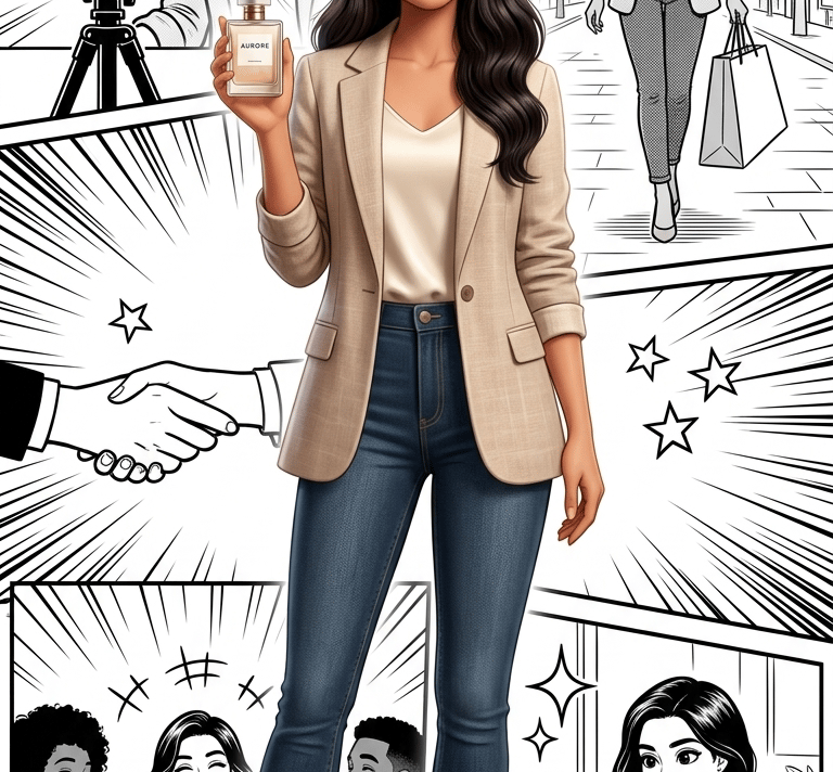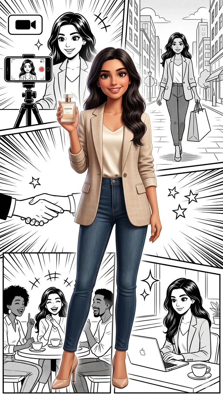 Behind her appears a black-and-white manga comic collage showing scenes of her presenting fragrances, talking to clients, recording social media content, walking confidently through a modern city, and celebrating success.