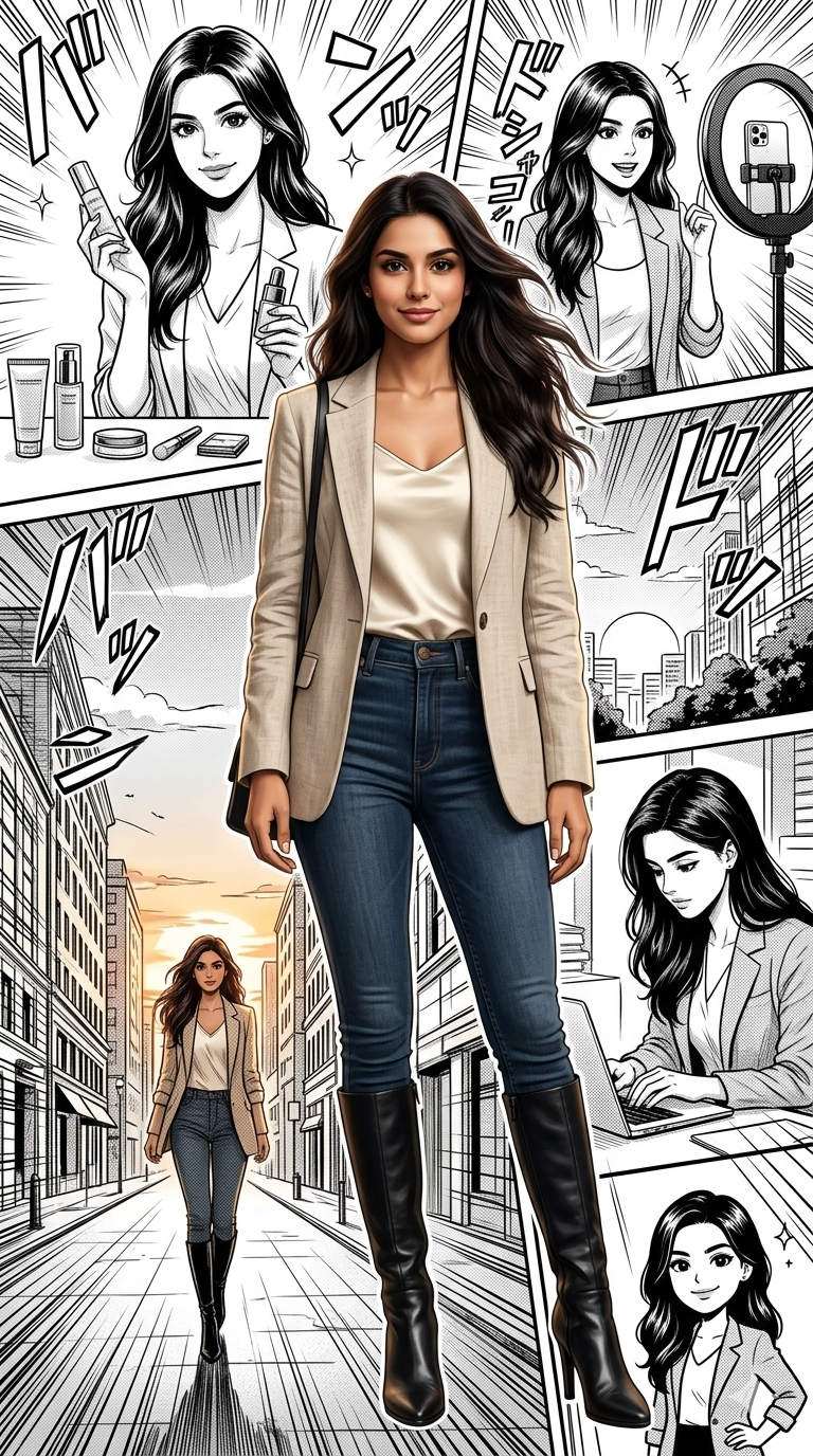 Behind her is a dramatic black-and-white manga comic collage showing scenes of her life: presenting beauty products, recording social media videos, walking through city streets at sunset, working on a laptop, and smiling confidently.