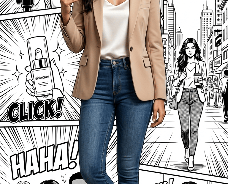 A confident woman wearing a fashionable casual outfit (stylish blazer, fitted jeans and elegant heels) stands centered with relaxed posture, slightly crossing one leg while holding a smartphone as if creating content.