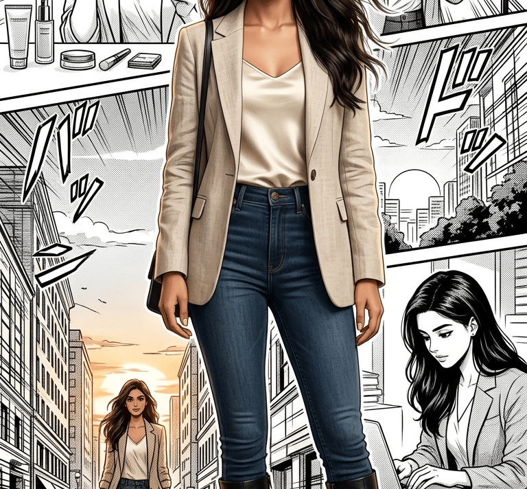 A woman whose face exactly matches the reference photo wears a stylish beige or cream blazer, elegant top, fitted jeans, and modern high-heel boots. She stands centered in a relaxed yet confident pose, one leg slightly crossed and one hand in her blazer pocket while the other rests naturally by her side.
